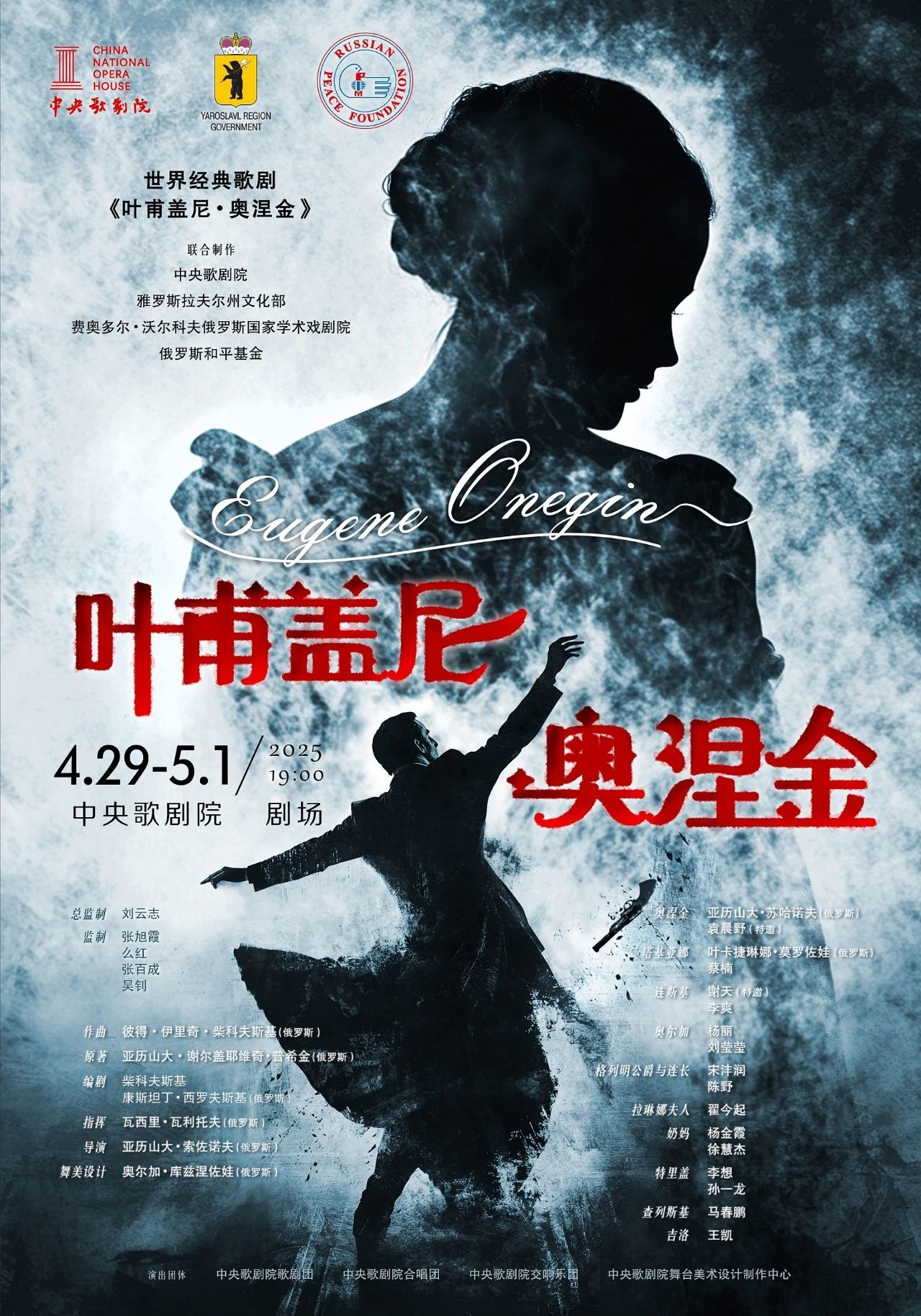 《奥涅金》作为中俄联合制作,由中央歌剧院会同雅罗斯拉夫尔州文化部、费奥多尔·沃尔科夫俄罗斯国家学术戏剧院、俄罗斯和平基金会共同出品;北京演出时间为2025年4月29日–5月1日。